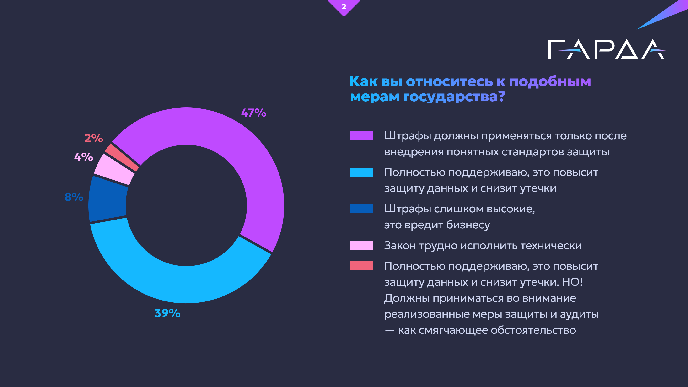 Большинство опрошенных организаций (85%) поддерживают инициативу государства с том или ином виде. Из них 40% однозначно считают, что политика регуляторов усилит киберзащиту, тогда как 45% считают, что штрафы возможны только после появления четких стандартов безопасности. Еще 8% компаний уверены, что санкции чрезмерны и мешают бизнесу.