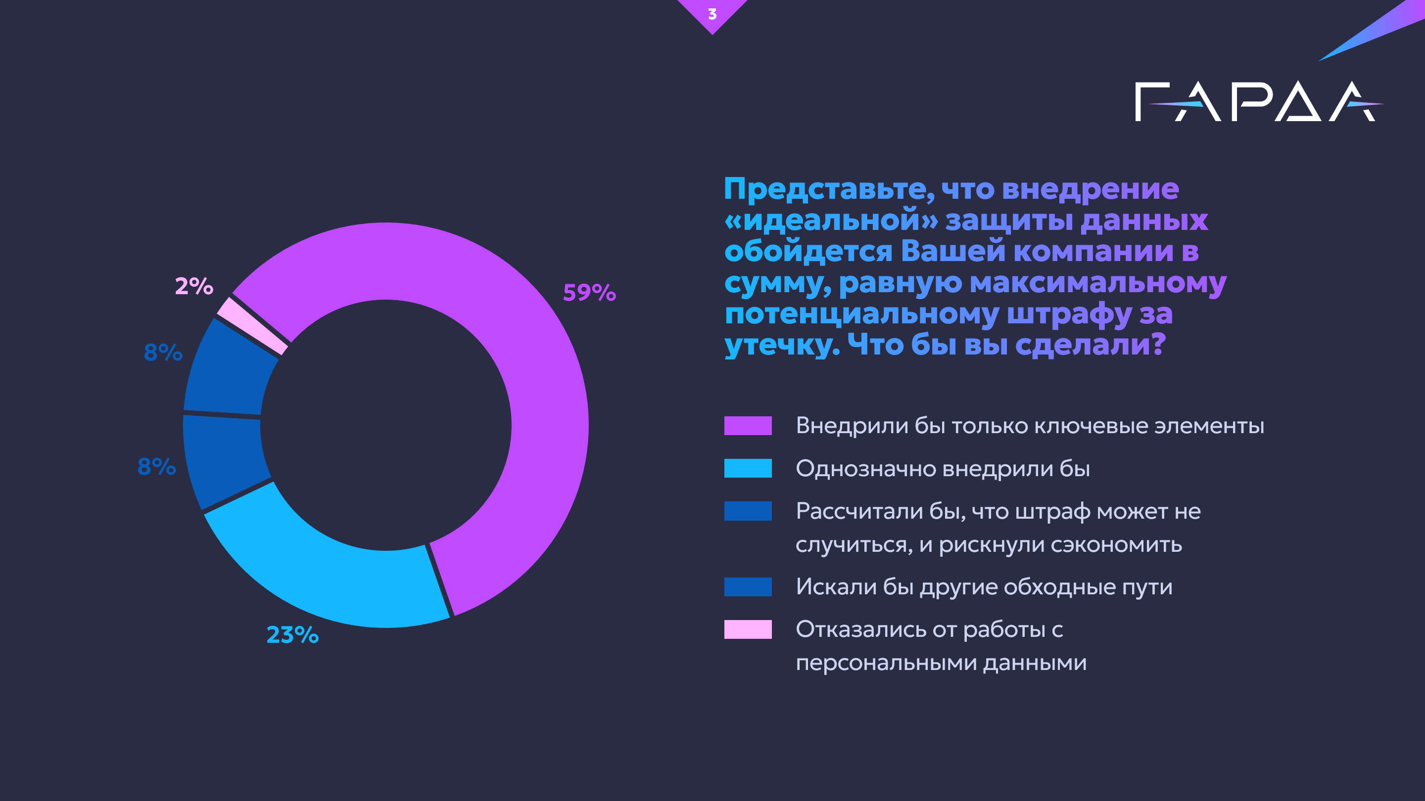 Если бы стоимость «идеальной» защиты совпала с суммой максимального штрафа, 27% компаний все равно внедрили бы ее полностью, 53% ограничились бы основными мерами, а почти 10% предпочли бы рискнуть и сэкономить. Среди последних больше всего (40%) представителей малого и среднего бизнеса из сегмента ритейл/e-commerce.