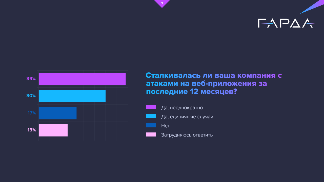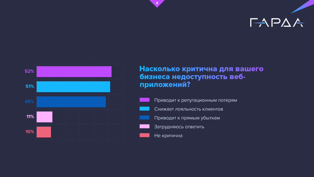 Для 79% компаний недоступность веб-приложений критична. Нарушения в работе ведут к прямым убыткам и потере доверия клиентов, что превращает защиту приложений в задачу бизнеса, а не только службы ИБ.