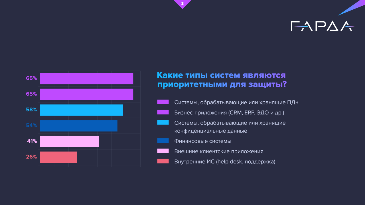 Наибольшее внимание организации уделяют защите CRM, ERP, ЭДО и систем, работающих с персональными и конфиденциальными данными.